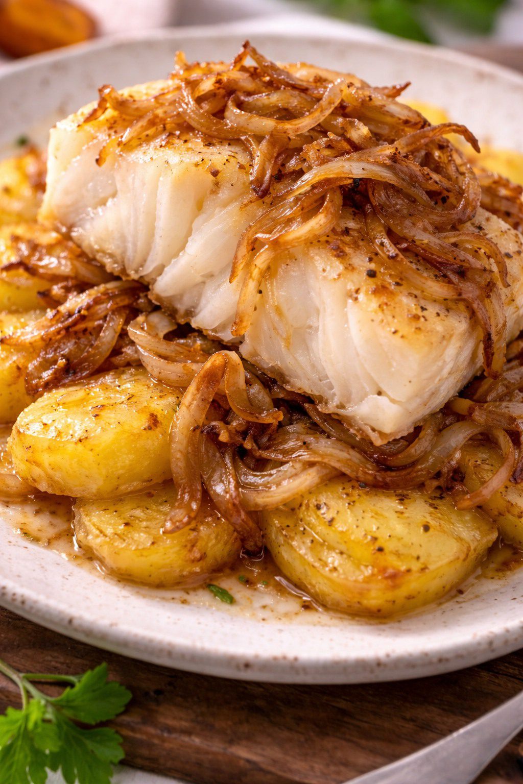 El Bacalao al Horno a la Portuguesa ofrece una combinación perfecta de texturas. El bacalao queda tierno, jugoso y ligeramente laminado, mientras que las patatas absorben el aceite aromatizado y los jugos del pescado. La cebolla caramelizada y los pimientos aportan dulzor y profundidad.