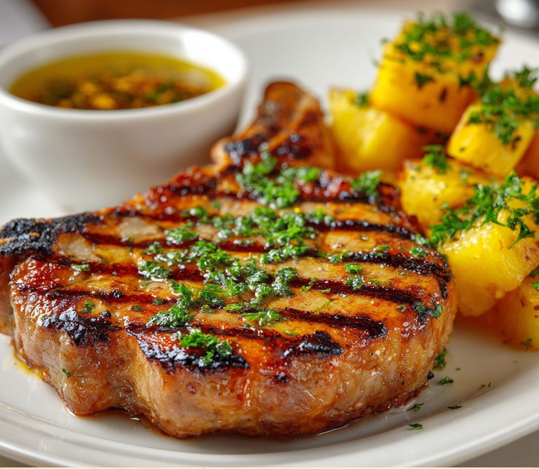 Mezcla salsa de soja, miel, jugo de piña, ajo, sal y pimienta. Unta las chuletas y deja marinar 30–40 min.