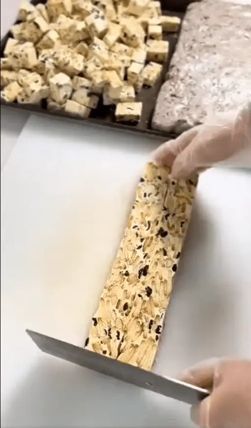 Con el tiempo, se han desarrollado versiones más suaves y cremosas, como el turrón de yema o el turrón blando con manteca de cacao. El que se muestra en la imagen que analizamos parece una versión nougat blando, elaborada artesanalmente con nueces, pasas y trozos de frutas, cortada en cubos uniformes, ideal para disfrutar con café o regalar en ocasiones especiales.