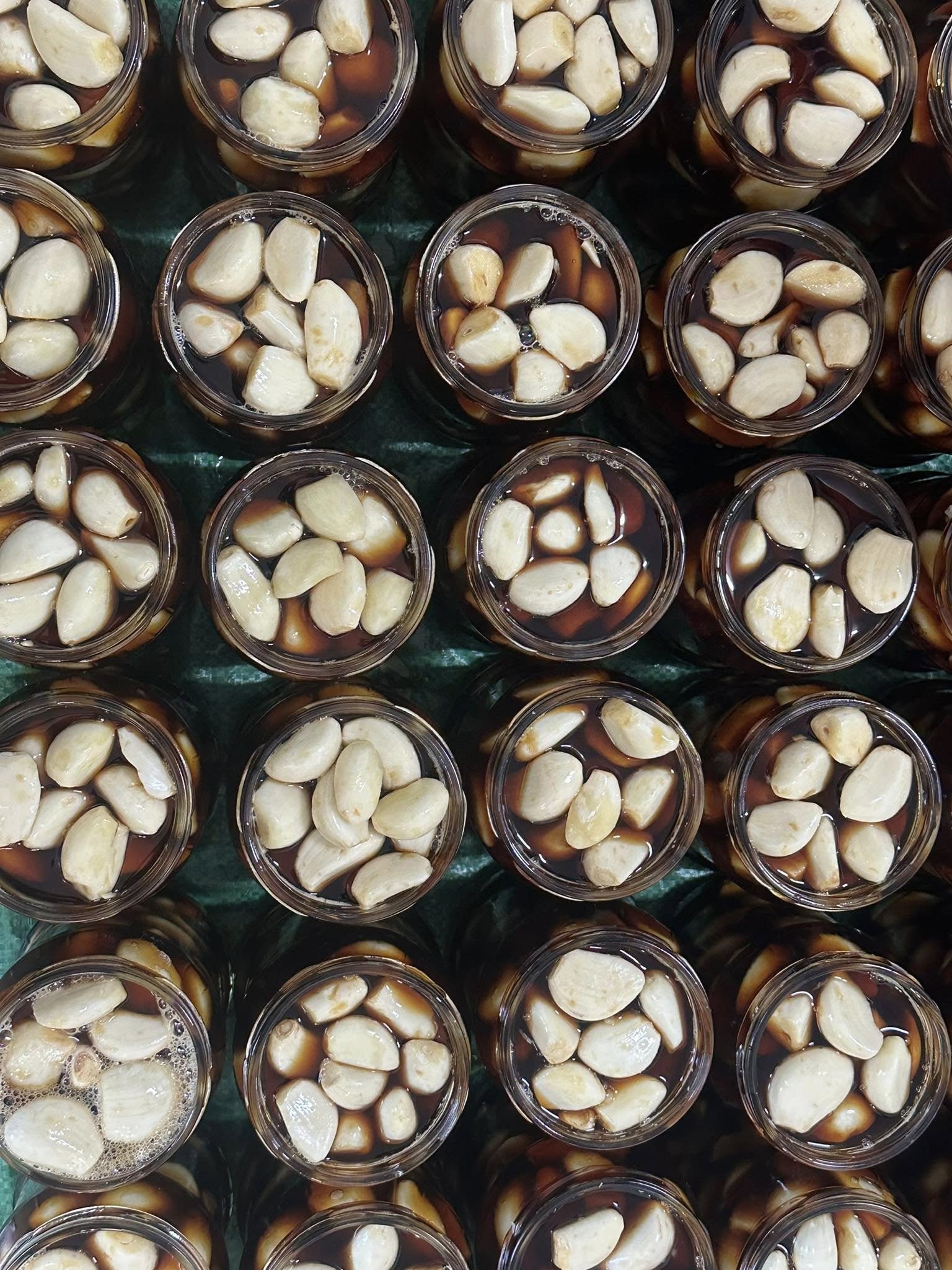 Pasados los 3–5 días, abre el frasco y retira la mitad del líquido. Completa el espacio vacío con salsa de soya hasta cubrir nuevamente todos los ajos. Vuelve a tapar bien el frasco y deja reposar en un sitio fresco por 15–20 días más.